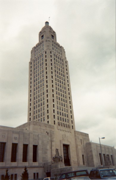 As the tallest state capitol in the United States, the building is 450 feet high with 34 floors. Construction was completed in March, 1932, in a mere 14 months. In 1935, the Louisiana State Capitol Building was the site of Huey P. Long's assassination. Senator Long was buried on the grounds and his statue faces the Capitol. |