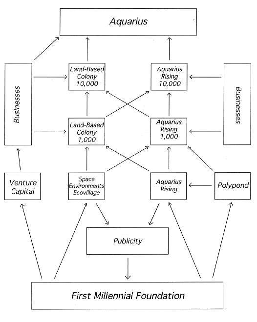 By the time Aquarius is built, there will be an FMF colony system, not just SEE. One idea behind Aquarius is that it is part of settling wherever our technology can take us. Our long-range goal is the colonization of the galaxy, but there are nearer places to be colonized first, especially the vast ocean "deserts." The nearer places also include the land deserts, and the system of FMF colonies is likely to include colonies there. The land-desert colonies would be analogous to Aquarius in several ways. Primarily they would also be a means of developing productive settlements from currently unusable space. As an analogue of mariculture as the economic base of Aquarius, desert agriculture as developed in Israel would be used. For energy, the deserts offer a good chance for the development of direct solar energy. The desert colonies appear to have a sound technological basis currently available. Other areas that are little used now are mountainous and polar. These two areas do not have a current technology for settling them, but we may well work on developing such technology. There would also likely be shore-based colonies, off-shore colonies, and colonies on seamounts (areas of the sea where the depth is less than 100 meters but where there is not any actual land). The various colonies, wherever based, would have several functions. Research and planning on how to settle new regions would be one such function. This includes regions on Earth that currently have little value or limited space as well as in space where the frontier is nearly endless. Another function would be to accommodate a range of personal commitments. While SEE involves a large commitment now, when it is well established and other higher commitment locations are settled, it is likely to be viewed as a low-commitment place. SEE would provide a place where someone could try living in an FMF colony to see if they wish to move on to greater commitments. The colony system will be the focus of recruiting in the future. Public relations will highlight the accomplishments and aims of the various colonies. Books will detail how they were built and encourage others to follow. The colony system, as a whole, will provide the economic basis for paying for transport to space and for settling there. This system will have widely diversified assets in many countries and in many lines of business and held by many people with a common goal. No downturn of fortunes in one business, one country, or of one person will affect the overall goal of settling life wherever we can develop the technology to do so. The following chart shows some of the relations of SEE to other FMF activities. The Millennial Project outlines the first two major milestones on our way to settling the galaxy as the formation of the First Millennial Foundation and the formation of Aquarius. These two major milestones are shown at the bottom and top of the figure (with time thus progressing upwards). There will be many other accomplishments between these two major milestones. The ones on which work is currently under way are shown as the next layer up. These are the Polypond, Aquarius Rising (AR), SEE, and the venture-capital corporation included in the plans for SEE. These are all supported directly by the FMF (as shown by the arrows). Furthermore, SEE and AR, as foci for publicity, would support recruiting for the FMF. Experience from both SEE and AR would lead to the next level of projects. These would be land-based and ocean-based colonies of about 1,000 people each. These colonies would also begin to get the advantage of experience we expect to gain from the operation of businesses. The businesses are supported in part by the venture-capital corporation. The venture-capital corporation in turn is supported by all members of the FMF, especially those in colonies. The figure shows an additional level of growth to colonies of 10,000 people, both land-based and ocean-based, before reaching the goal of Aquarius at 100,000 people. The ocean-based colony at this time might be built on a seamount, while the land based colony would involve developing land currently of low productivity such as land with little rainfall. |