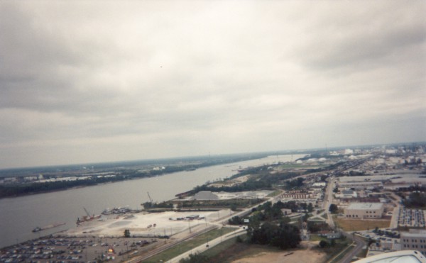 | Here is a northwest view from the Observation Deck of the Louisiana State Capitol Building. You can see the Mississippi River as it flows southward. The Mississippi River rises at Lake Itasca in Minnesota and flows south, meeting its major tributaries, the Missouri and the Ohio rivers. | |